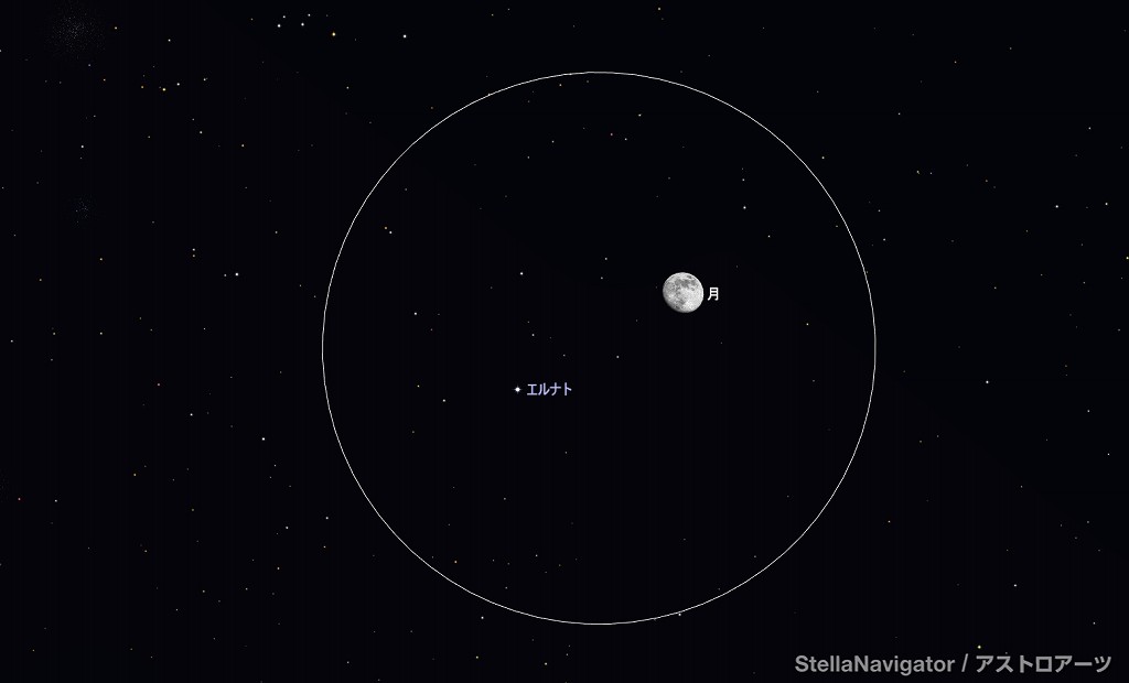 ![]() 2025年1月10日21時ごろの南の空。 黄線:黄道、赤線:天の赤道 (月齢10.6) ![]() 月とすばる(プレアデス星団) (視野円7度) ![]() 2025年1月11日21時ごろの南の空。 黄線:黄道、赤線:天の赤道 (月齢11.6) ![]() 月とエルナト (視野円7度) |