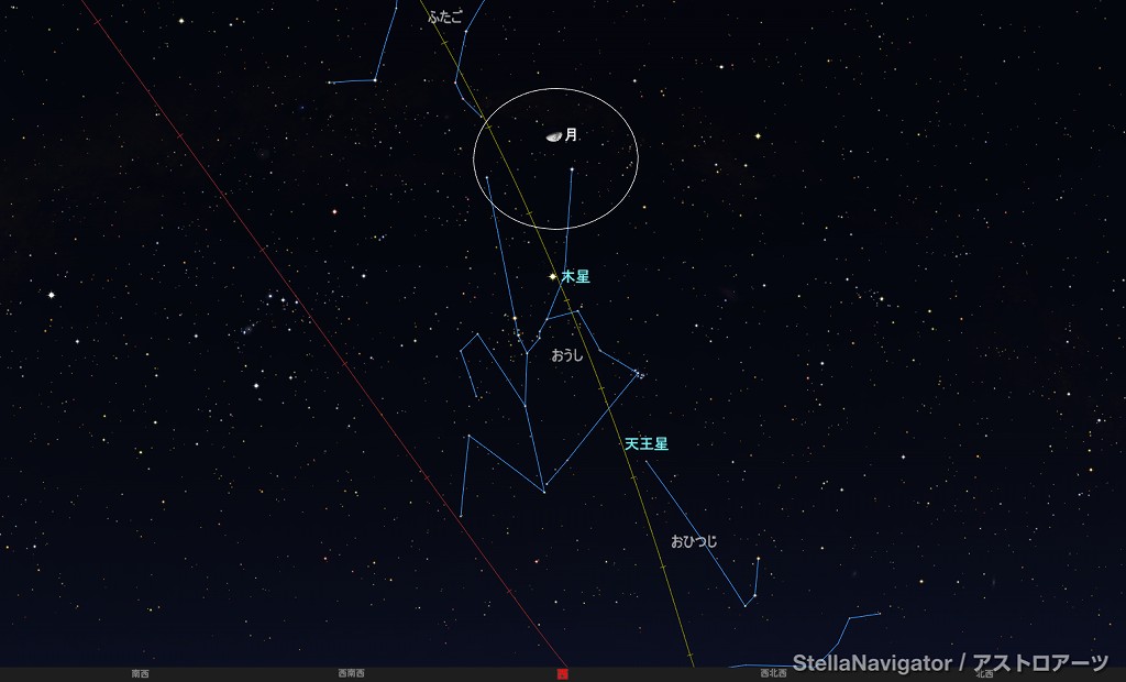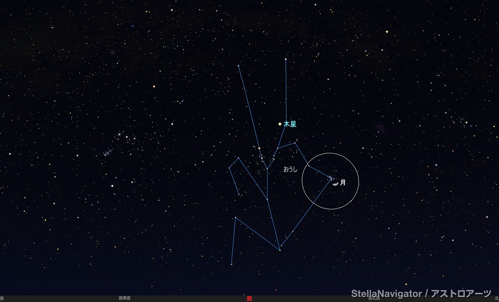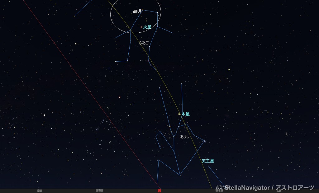 ![]() ![]() すばる食(プレアデス星団食) 2025年3月5日22時ごろの西の空。 月の高さは約20度。 ![]() ![]() すばる食(プレアデス星団食) 2025年3月5日23時ごろの西の空。 月の高さは約10度。 |