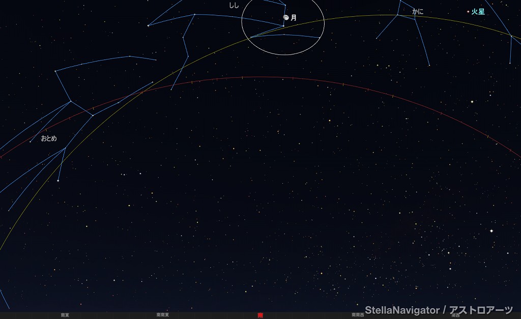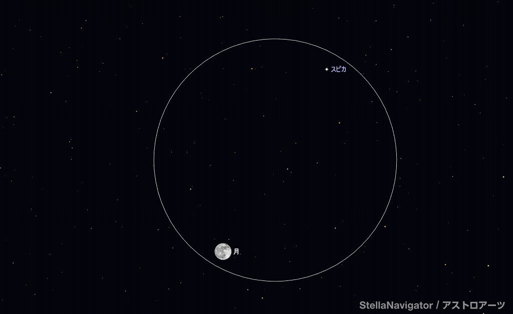 ![]() 2025年4月8日21時ごろの南の空。 黄線:黄道、赤線:天の赤道 (月齢10.0) ![]() 月とレグルス (視野円7度) ![]() 2025年4月13日22時ごろの南東の空。 黄線:黄道、赤線:天の赤道 (月齢15.1) ![]() 満月とスピカ (視野円7度) |