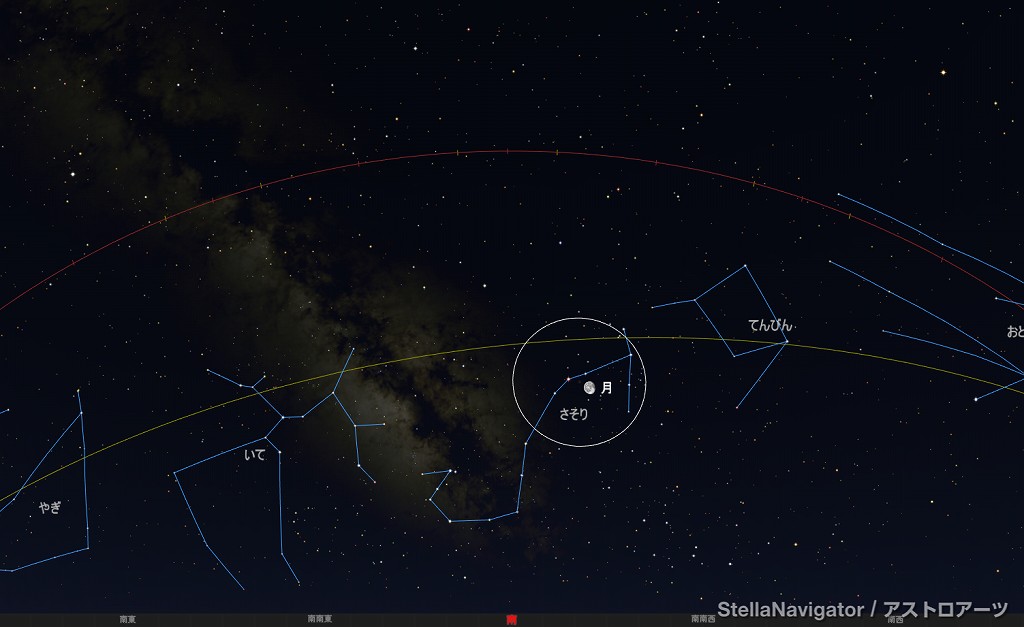 ![]() 2025年4月17日未明3時ごろの南の空。 黄線:黄道、赤線:天の赤道 (月齢18.3) ![]() 月とアンタレス (視野円7度) |