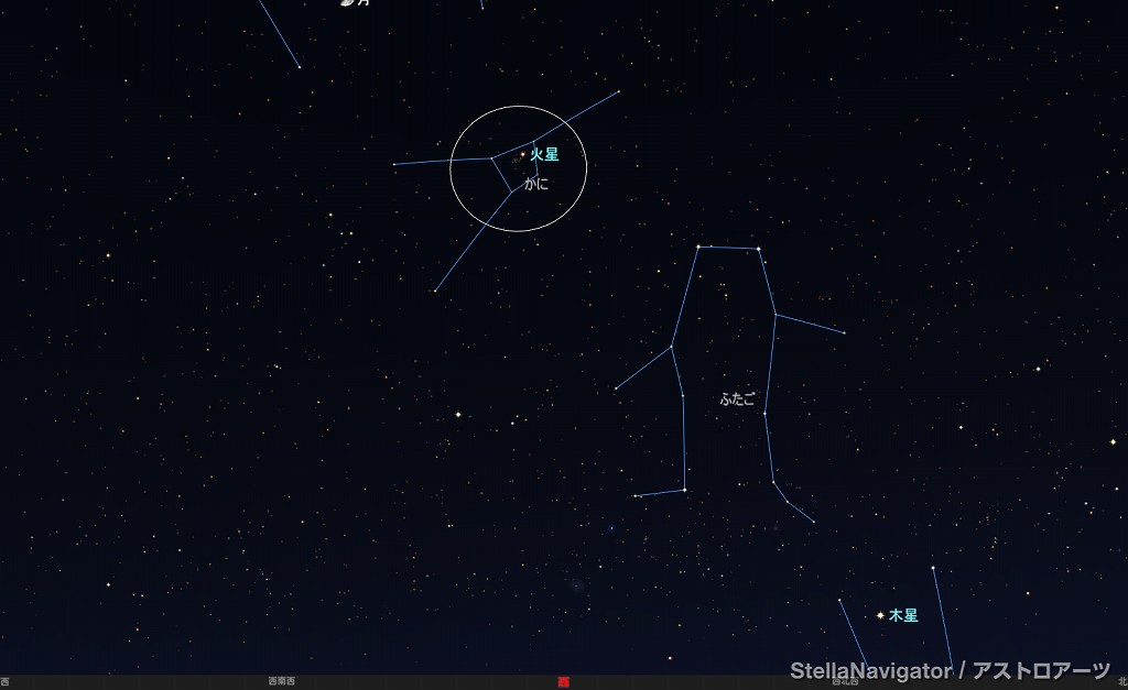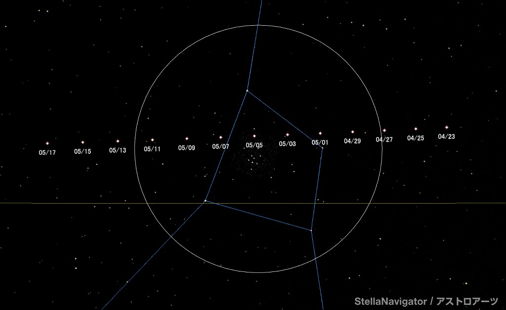 ![]() 2025年5月5日21時ごろの西の空。 火星が、かに座のプレセペ星団の中へ。 ![]() 火星の移動の様子。 黄線は黄道。 (視野円7度) |