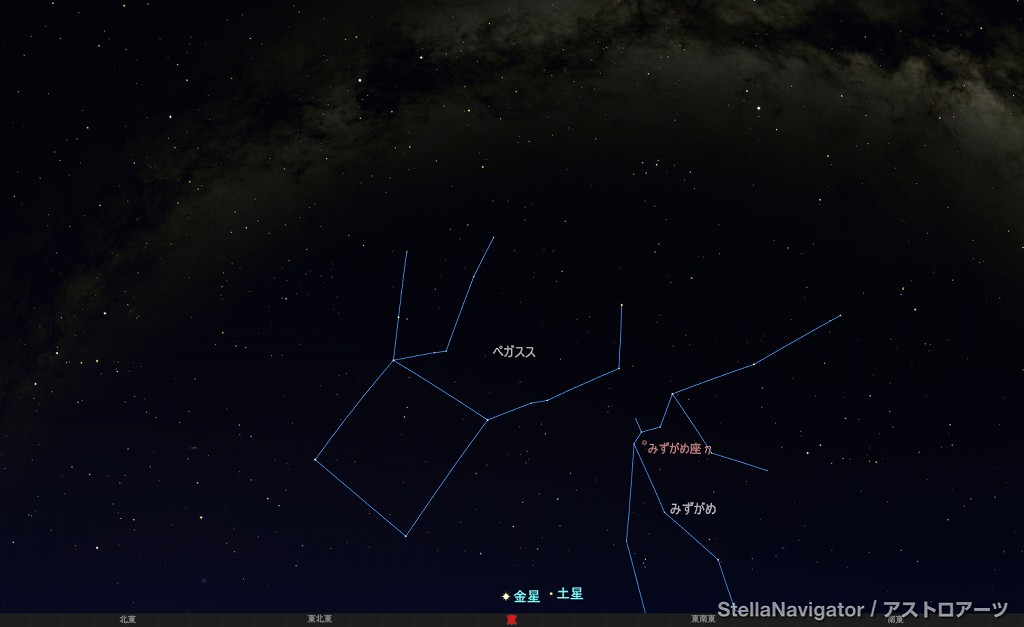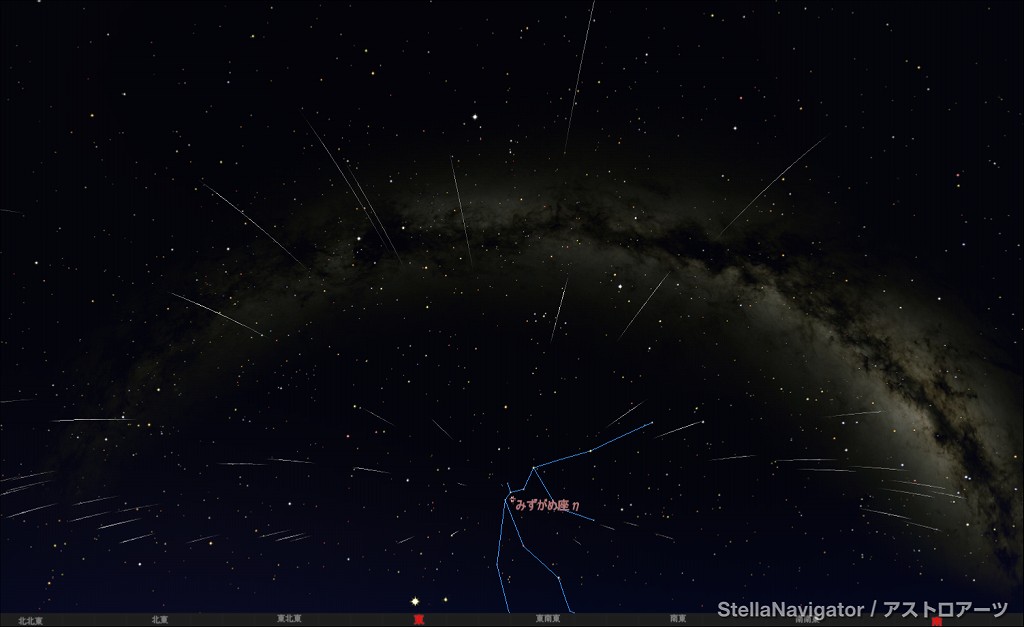 ![]() 2025年5月6日未明3時ごろの東の空。 みずがめ座η(エータ)流星群が極大。 (ピンク色の十字が放射点=流星が飛ぶ中心点) ![]() 6日未明3時ごろの様子。 (図はシミュレーションです。) |