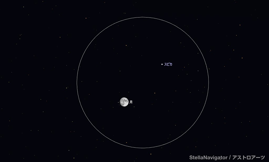 ![]() 2025年5月5日20時ごろの南の空。 黄線:黄道、赤線:天の赤道 (月齢7.6) ![]() 上弦の半月とレグルス (視野円7度) ![]() 2025年5月10日22時ごろの南の空。 黄線:黄道、赤線:天の赤道 (月齢12.7) ![]() 月とスピカ (視野円7度) |