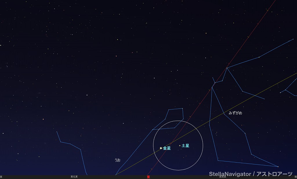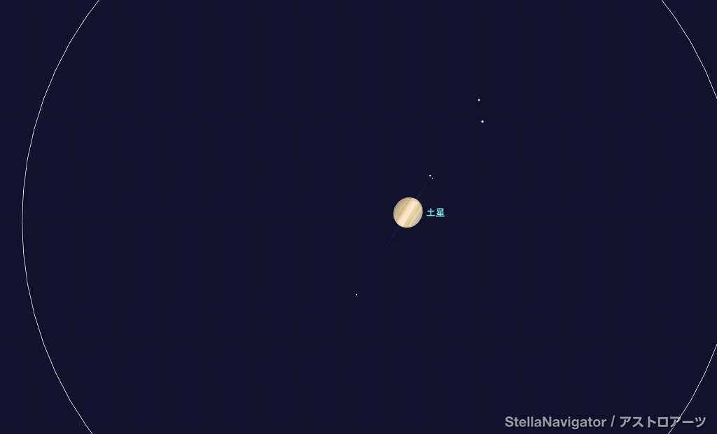 ![]() 2025年5月7日、日の出1時間前ごろの東の空。 土星の地平高度は約9度。 ![]() シミュレーションでは、 環が薄い状態ですけど、 実際に観望するとどうでしょうか? (視野円0.1度) |