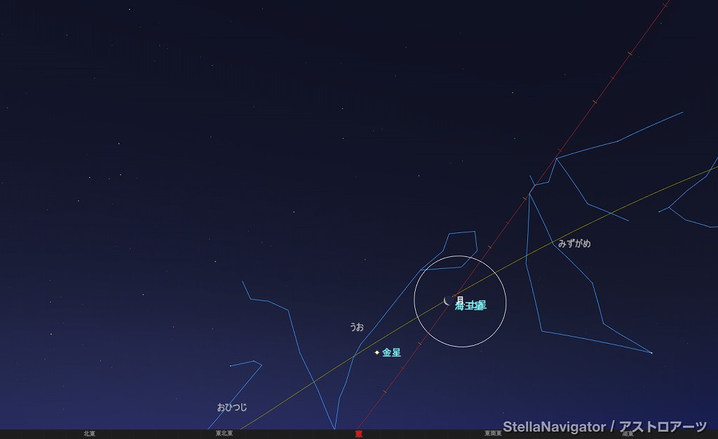 ![]() 2025年5月23日、日の出1時間前ごろの東の空。 黄線:黄道、赤線:天の赤道 (月齢25.0) ![]() 月、土星、海王星 (視野円7度) ![]() 2025年5月24日、日の出1時間前ごろの東の空。 黄線:黄道、赤線:天の赤道 (月齢26.0) ![]() 逆三日月と明けの明星=金星 (視野円7度) |