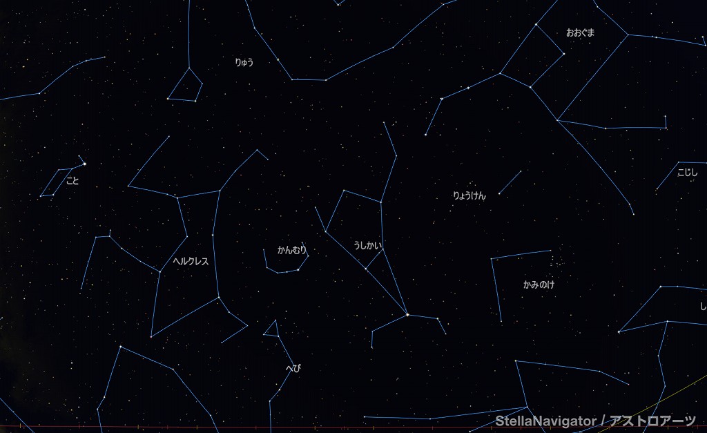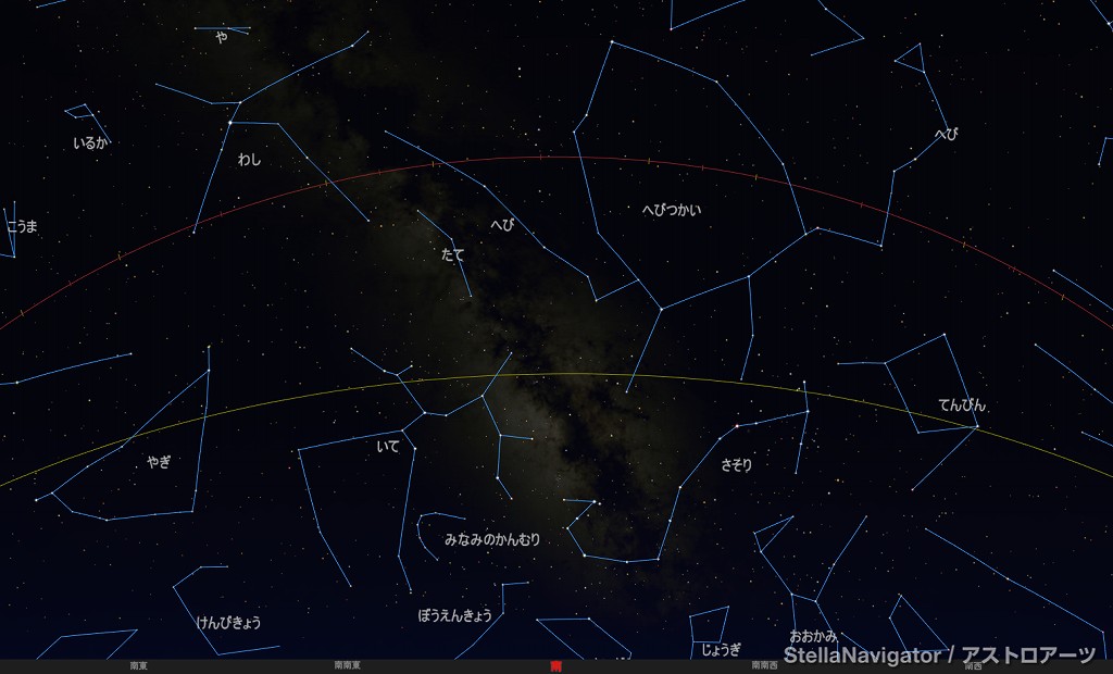 ![]() 2025年6月の星空の様子 (黄線:黄道、赤線:天の赤道) 南の空 上旬22時ごろ 中旬21時ごろ 下旬20時ごろ (以下、同様) ![]() 南〜天頂 ![]() 東の空 ![]() 北の空 ![]() 西の空 ![]() 星座早見 (南が下) ![]() 2025年6月の星空の様子 (黄線:黄道、赤線:天の赤道) 南の空 上旬1時ごろ 中旬0時ごろ 下旬23時ごろ (以下、同様) ![]() 南〜天頂 ![]() 東の空 ![]() 北の空 ![]() 西の空 ![]() 星座早見 (南が下) |