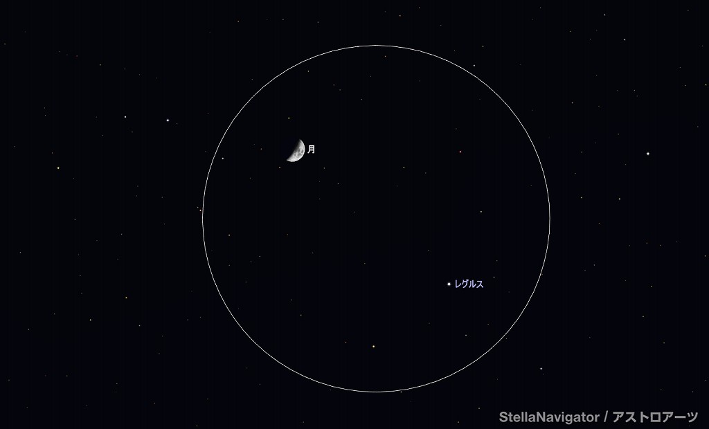 ![]() 2025年6月2日21時ごろの西の空。 黄線:黄道、赤線:天の赤道 (月齢6.4) ![]() 上弦の半月とレグルス (視野円7度) ![]() 2025年6月6日21時ごろの西の空。 黄線:黄道、赤線:天の赤道 (月齢10.4) ![]() 月とスピカ (視野円7度) |