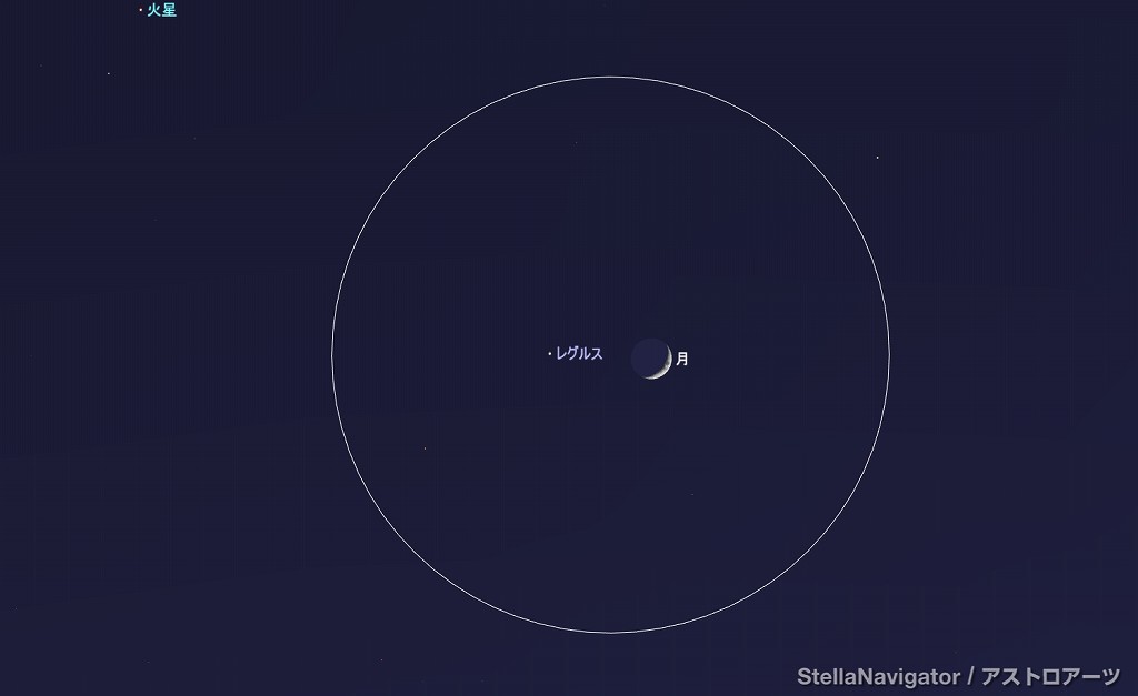 ![]() 2025年6月29日20時ごろの西の空。 黄線:黄道、赤線:天の赤道 (月齢4.0) ![]() 三日月とレグルス (視野円7度) |