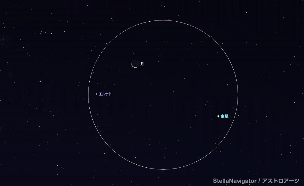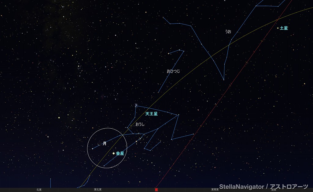 ![]() 2025年7月22日未明3時ごろの東の空。 黄線:黄道、赤線:天の赤道 (月齢26.3) ![]() 新月前の細い月、金星、エルナト (視野円10度) |