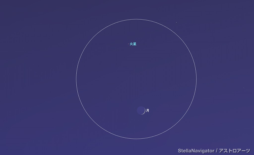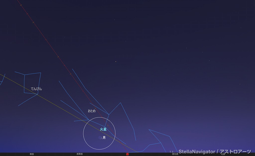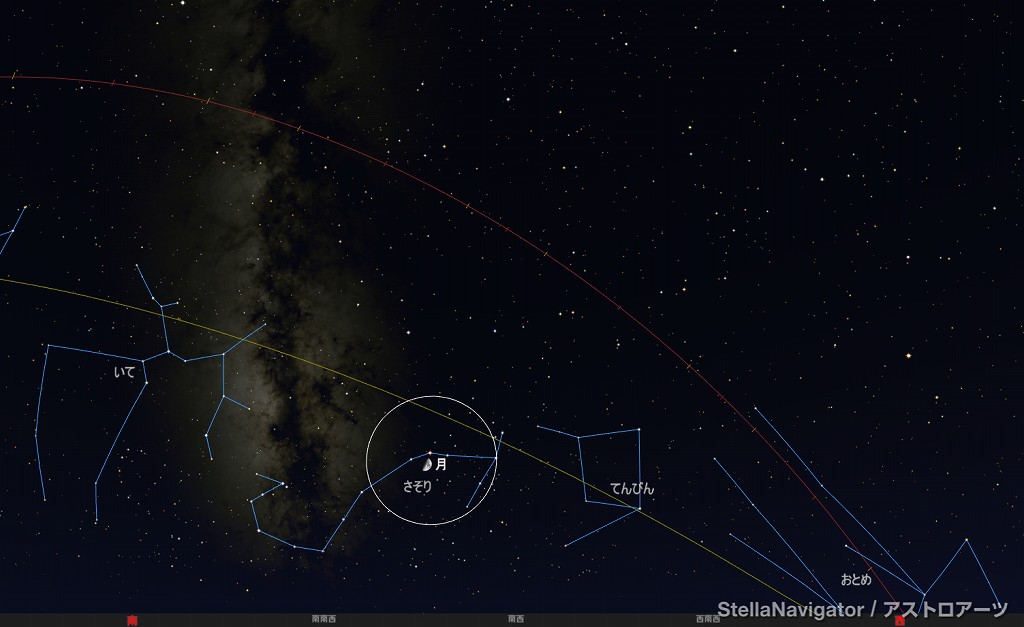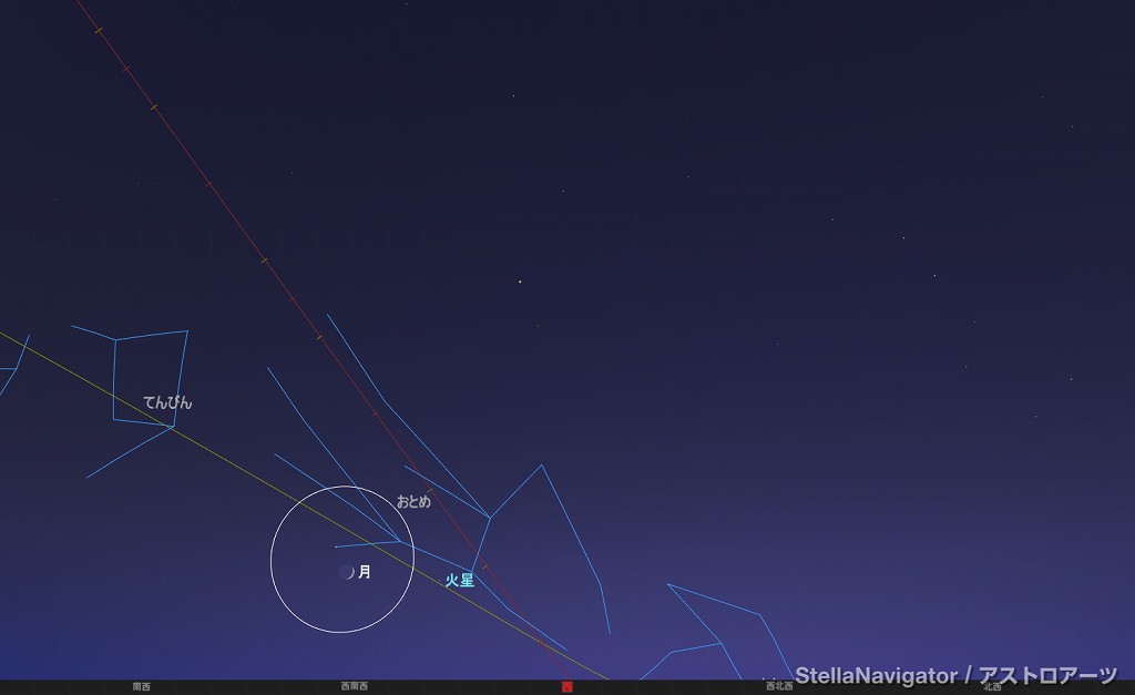 ![]() 2025年8月26日日没1時間後ごろの西の空。 黄線:黄道、赤線:天の赤道 (月齢3.2) ![]() 細い月と火星 (視野円7度) ![]() 2025年8月27日日没1時間後ごろの西の空。 黄線:黄道、赤線:天の赤道 (月齢4.2) ![]() 三日月とスピカ (視野円7度) ![]() 2025年8月31日20時ごろの南西の空。 黄線:黄道、赤線:天の赤道 (月齢8.2) ![]() 上弦の半月とアンタレス (視野円7度) |