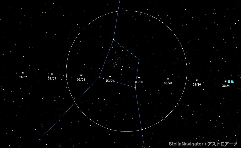 ![]() 2025年9月1日、日の出1時間前ごろの東の空。 金星がプレセペ星団に入っていて、楽しい。 ![]() 金星の移動の様子。 黄線が黄道(太陽の通り道)。 (視野円10度) |