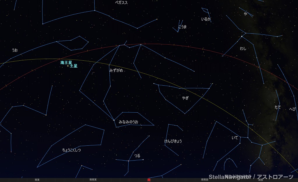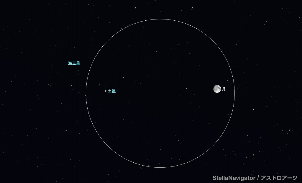 ![]() 2025年10月5日22時ごろの南の空。 黄線:黄道、赤線:天の赤道 (月齢13.7) ![]() 月と土星 (視野円10度) |
