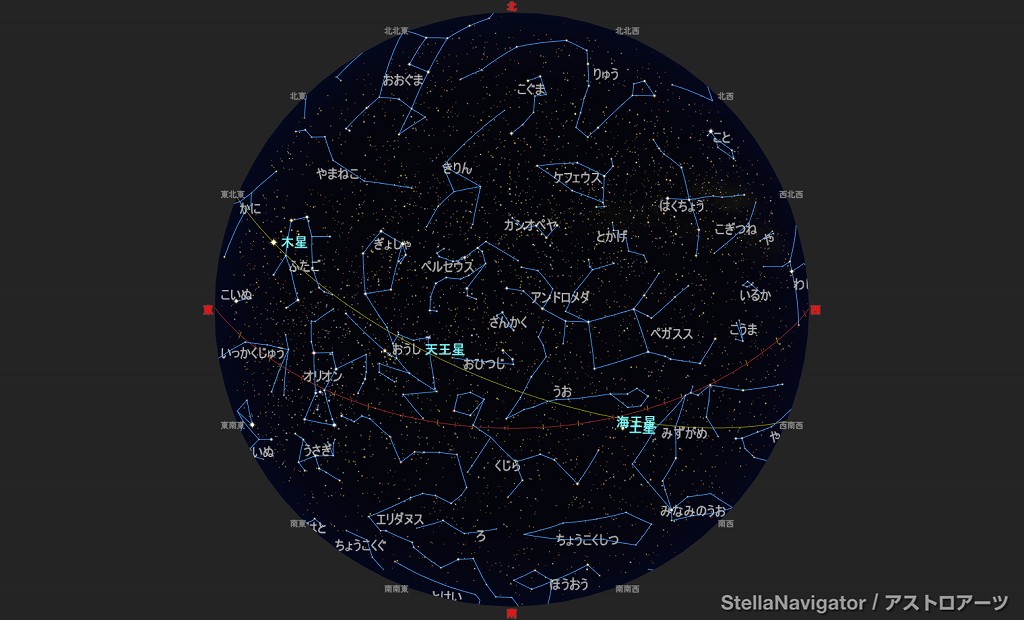 ![]() 2025年10月の星空の様子 (黄線:黄道、赤線:天の赤道) 南の空 上旬21時ごろ 中旬20時ごろ 下旬19時ごろ (以下、同様) ![]() 南〜天頂 ![]() 東の空 ![]() 北の空 ![]() 西の空 ![]() 星座早見 (南が下) ![]() 2025年10月の星空の様子 (黄線:黄道、赤線:天の赤道) 南の空 上旬1時ごろ 中旬0時ごろ 下旬23時ごろ (以下、同様) ![]() 南〜天頂 ![]() 東の空 ![]() 北の空 ![]() 西の空 ![]() 星座早見 (南が下) |