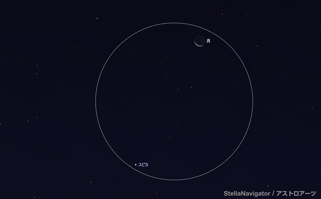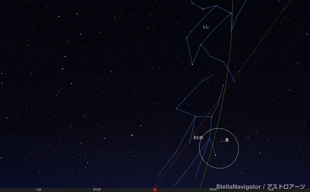 ![]() 2025年11月13日未明3時ごろの東の空。 黄線:黄道、赤線:天の赤道 (月齢22.2) ![]() 月とレグルス (視野円7度) ![]() 2025年11月17日早朝5時ごろの東の空。 黄線:黄道、赤線:天の赤道 (月齢26.3) ![]() 月とスピカ (視野円7度) |