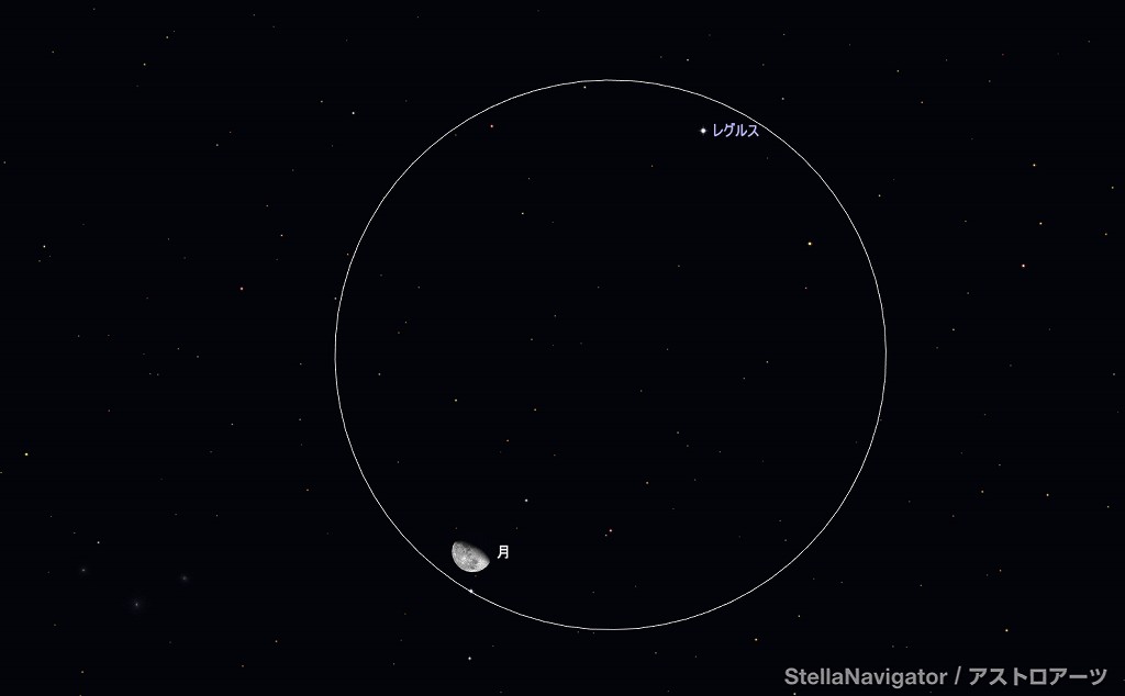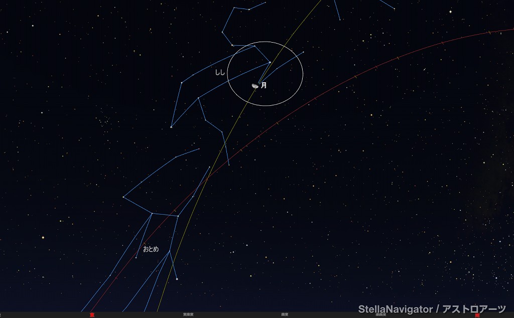 ![]() 2025年12月11日未明3時ごろの南東の空。 黄線:黄道、赤線:天の赤道 (月齢20.5) ![]() 月とレグルス (視野円7度) ![]() 2025年12月15日早朝5時ごろの南東の空。 黄線:黄道、赤線:天の赤道 (月齢24.5) ![]() 月とスピカ (視野円7度) |