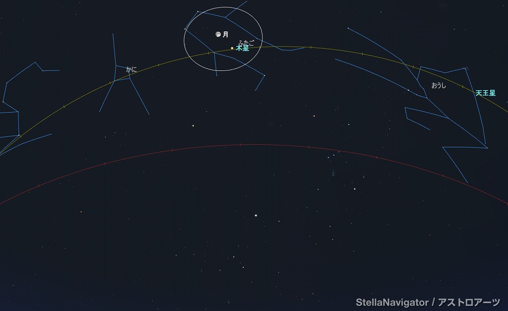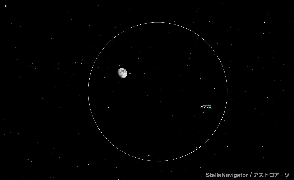 ![]() 2026年2月27日20時ごろの南の空。 黄線:黄道、赤線:天の赤道 (月齢10.0) ![]() 月と木星 (視野円7度) |