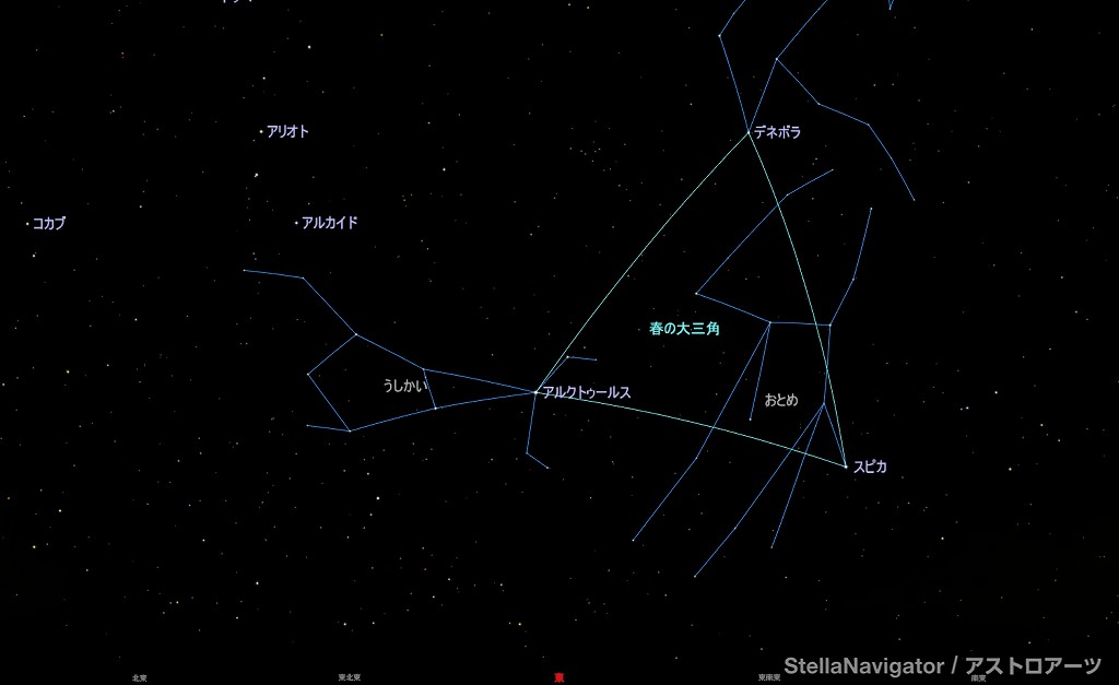 | ★彡〜☆彡〜★彡〜☆彡〜★彡〜☆彡〜★彡〜☆彡〜★彡〜☆彡〜★彡〜☆彡 今宵はどんな星空が見えるでしょう。。。 ☆彡 流 れ 星 か ら の 贈 り 物 ★彡 第1064号 2026年3月16日発行 ☆彡〜★彡〜☆彡〜★彡〜☆彡〜★彡〜☆彡〜★彡〜☆彡〜★彡〜☆彡〜★彡 こんにちは。 「流れ星」の鈴木です。 ご愛読いただいている皆さま、 新しく読者登録していただいた方、 本当にありがとうございます。 それでは、今週もよろしくお願いします☆彡 ★彡〜☆彡〜★彡〜☆彡〜★彡〜☆彡〜★彡〜☆彡〜★彡〜☆彡〜★彡〜☆彡 ★今週の話題 ☆彡〜★彡〜☆彡〜★彡〜☆彡〜★彡〜☆彡〜★彡〜☆彡〜★彡〜☆彡〜★彡 ★1.さよなら三角 またきて三角 ★2.春分のおさらい ★3.編集後記 ★彡〜☆彡〜★彡〜☆彡〜★彡〜☆彡〜★彡〜☆彡〜★彡〜☆彡〜★彡〜☆彡 ★1.さよなら三角 またきて三角 ☆彡〜★彡〜☆彡〜★彡〜☆彡〜★彡〜☆彡〜★彡〜☆彡〜★彡〜☆彡〜★彡 おおいぬ座のシリウス、 こいぬ座のプロキオン、 オリオン座のベテルギウス。 この3つの星がつくる冬の大三角形が、 早い時間に西へ傾くようになりました。 そして、 1等星祭りだった冬とは趣を変えるように、 春の夜空の1等星は3つと控え目。 しし座のレグルス、 おとめ座のスピカ、 うしかい座のアルクトゥルス。 (ケンタウルス座α星も1等星ですけど、 日本からは見ることができないので割愛します。) そして、 これら3つの1等星を繋ぐと、 とっても大きな二等辺三角形。 これが春の大三角形! だったら分かりやすかったのに。。。 あまりに大きい三角形だからなのか、 なんとなく形が良くない三角形だからなのか、 レグルスは仲間に入ることができなくて、 代わりに、同じしし座の2等星デネボラに その任を譲ることになった次第です。 デネボラは、 しし座の尻尾にある星で、 そのものズバリ「獅子の尾」の意味。 デネボラ、スピカ、アルクトゥルスがつくる 三角形は、まさに春の夜空の目印です。 http://nagarebosi-kirari.com/mailmaga4/20260316.html#01 この三角形の方向は、 ちょうど天の川の中心とは逆の方向にあたり、 あまり星が密集していない部分なので、 「星空の窓」と呼ばれることがあります。 この星空の窓から外の宇宙を覗くと、 私たちの銀河系(天の川)の仲間たちを たくさん見つけることが出来ます。 【関連トピック】 冬の1等星くらべっこ http://nagarebosi-kirari.com/mailmaga/20101206.html 春の1等星くらべっこ http://nagarebosi-kirari.com/mailmaga3/20220307.html 天翔ける人喰いライオン(しし座) http://nagarebosi-kirari.com/mailmaga/20090323.html 乙女のすがた しばしとどめむ(おとめ座) http://nagarebosi-kirari.com/mailmaga/20060417.html 牛を飼いつつ熊も追ってま〜す(うしかい座) http://nagarebosi-kirari.com/mailmaga/20070409.html 銀河を望む星空の窓 http://nagarebosi-kirari.com/mailmaga/20060403.html ★彡〜☆彡〜★彡〜☆彡〜★彡〜☆彡〜★彡〜☆彡〜★彡〜☆彡〜★彡〜☆彡 ★2.春分のおさらい ☆彡〜★彡〜☆彡〜★彡〜☆彡〜★彡〜☆彡〜★彡〜☆彡〜★彡〜☆彡〜★彡 週末20日は「春分」です。 春分は、天文学的にみると、 次のような現象のことを指します。 春分:太陽が、天の赤道を南から北に通過する時 ↓ 夏至:太陽が、天の赤道からいちばん北寄りに離れた時 ↓ 秋分:太陽が、天の赤道を北から南に通過する時 ↓ 冬至:太陽が、天の赤道からいちばん南寄りに離れた時 ちなみに、春分の太陽は「うお座」に位置しています。 また、春分では、極周辺の高緯度地域を除いて、 太陽は真東から昇って真西に沈みます。 春分の太陽の南中高度は、 90度から各地域の緯度を引いたものと ほぼ同じになります。 具体的にはこんな感じです。 ★地 域 |★緯 度 |★太陽の南中高度 北海道稚内市|北緯45度24分|約44.5度 東 京 |北緯35度40分|約54.2度 沖縄県石垣市|北緯24度20分|約65.5度 さらに、春分は、 「二十四節気(にじゅうしせっき)」の1つでもあります。 二十四節気とは何でしょうか? 二十四節気は、旧暦(太陽太陰暦)を使っていたころ、 季節と暦(月日)がズレるのを補うためにつくられました。 1年を24等分し、 月の前半を「節気」、後半を「中気」として、 それぞれに季節を表す名称を付けました。 二十四節気の分割の仕方には次の2つがあります。 <定気法> 黄道(太陽の通り道)を、 春分点を基点(0度)として24に分ける。 空間分割法とも呼ばれる。 <平気法(恒気法)> 冬至を基点日として1年の時間を24に分ける。 時間分割法とも呼ばれる。 春分は冬至から91日目。 【関連トピック】 春分の太陽 http://nagarebosi-kirari.com/mailmaga/20090316.html 春分のおさらい はじまりは春分点 http://nagarebosi-kirari.com/mailmaga/20080317.html 昼と夜が同じになる日? http://nagarebosi-kirari.com/mailmaga/20060918.html 二十四節気って何? http://nagarebosi-kirari.com/mailmaga/20100315.html 【関連リンク】 春分の日はなぜ年によって違うの?(国立天文台) http://www.nao.ac.jp/QA/faq/a0302.html 春分の日・秋分の日には、昼と夜の長さは同じになるの?(国立天文台) http://www.nao.ac.jp/QA/faq/a03