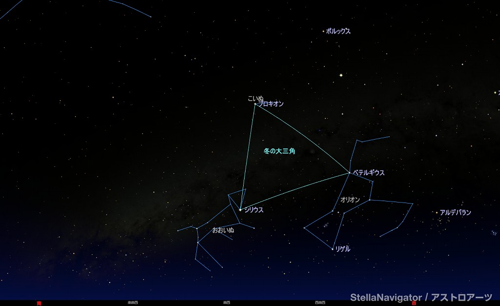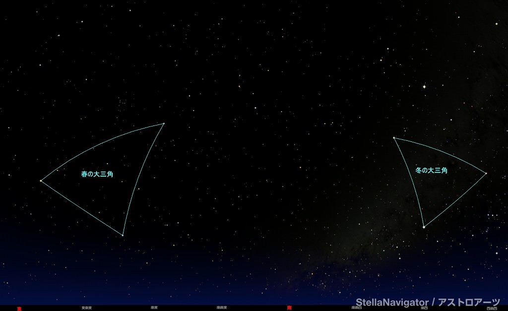![]() 3月中旬22時ごろの東の空。 しし座のデネボラ、 おとめ座のスピカ、 うしかい座のアルクトゥルスが 春の大三角形をつくります。 ![]() 同じ時間の南西の空。 オリオン座のベテルギウス、 こいぬ座のプロキオン、 おおいぬ座のシリウスがつくる 冬の大三角形は だいぶ西に傾いています。 ![]() 星図上、形が歪んでしまっていますけど、 比べてみると、 春の大三角形の方が 大きいことが分かります。 |