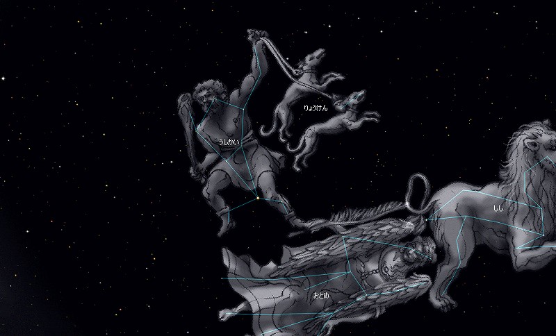 ![]() 2006年1月30日夜21時ごろの南の空。 おおいぬ座とこいぬ座については、 コチラをご覧ください。 ![]() 6月1日夜21時。 南に身体を向けて、そのまま天頂を見上げた時のイメージです。 牛飼いが2匹の猟犬を連れています。 ![]() 6月15日夜21時の南の空。 おおかみ座はかなり低いため、 地域によっては見ることは難しいでしょう。 |