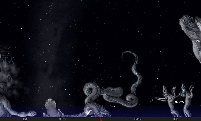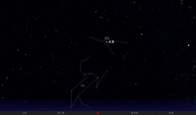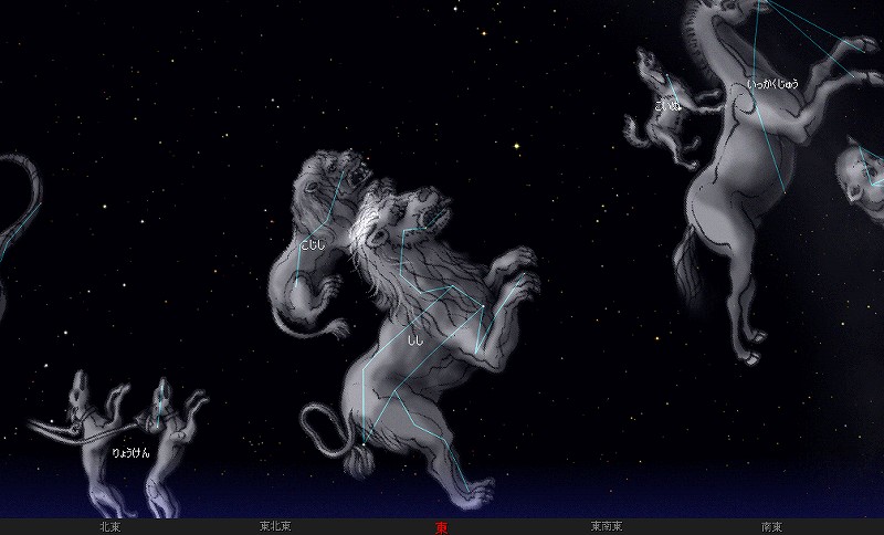 ![]() 4月15日夜21時ごろ。 南に身体を向けて、そのまま天頂を見上げてみて下さい。 しし座のカッコイイ姿をぜひご覧ください。 |