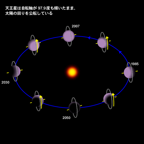 | ★彡〜☆彡〜★彡〜☆彡〜★彡〜☆彡〜★彡〜☆彡〜★彡〜☆彡〜★彡〜 今夜はどんな星空が見えるでしょう。。。 ☆彡 流 れ 星 か ら の 贈 り 物 ★彡 第17号 2006年2月20日発行 ★彡〜☆彡〜★彡〜☆彡〜★彡〜☆彡〜★彡〜☆彡〜★彡〜☆彡〜★彡〜 こんにちは。 「流れ星」の鈴木です。 引き続き、ご愛読いただいている方々はもちろんのこと、 新しく読者登録していただいた皆さん、 本当にありがとうございます。 無駄話は編集後記にまわすことにして、さっそく本題にいきましょう。 それでは、今週もよろしくお願いします。 ★彡〜☆彡〜★彡〜☆彡〜★彡〜☆彡〜★彡〜☆彡〜★彡〜☆彡〜★彡〜☆彡 ☆今週の話題 ★彡〜☆彡〜★彡〜☆彡〜★彡〜☆彡〜★彡〜☆彡〜★彡〜☆彡〜★彡〜☆彡 ☆1.月とアンタレスが接近(22日未明) ☆2.天王星 発見伝ハッケンデン 発見デンデンデデンデン レツゴー! ☆3.天王星のなが〜い昼となが〜い夜 ☆4.編集後記 ★彡〜☆彡〜★彡〜☆彡〜★彡〜☆彡〜★彡〜☆彡〜★彡〜☆彡〜★彡〜☆彡 ☆1.月とアンタレスが接近(22日未明) ★彡〜☆彡〜★彡〜☆彡〜★彡〜☆彡〜★彡〜☆彡〜★彡〜☆彡〜★彡〜☆彡 さそり座の赤い1等星アンタレスは、 月の通り道である白道(はくどう)内に位置しているため、 アンタレスと月が近づくことがたまにあります。 22日の未明(明け方)には、 アンタレスと月がかなり接近して並ぶ様子がご覧いただけます。 最接近時には、その離隔度は1度を切るので、 かなり近づいて見えることになります。 ところで。。。 昨年2005年3月31日には、 月がアンタレスに近づくどころか、隠してしまう「アンタレス食」があり、 全国的に観望することが出来ました。 この時は、私も家のベランダから狙っていまして、 「う〜、こういう時はやっぱり赤道儀が欲しい〜」とか思いながら、 なんとか撮影には成功しました。 アンタレスは実は、緑色の伴星を従えた二重星なのですが、 明るい主星が月から出現する一瞬前に 暗い伴星が出現する様子も見ることができました。 残念ながら、私はそこまで確認はできませんでしたが、 アマチュア天文家の方々の間でも広く、 写真やビデオなどで撮影に成功しています。 22日の月とアンタレスの位置、 2005年3月31日のアンタレス食の様子はコチラ☆彡 http://nagarebosi-kirari.com/mailmaga/20060220.html#01 ★彡〜☆彡〜★彡〜☆彡〜★彡〜☆彡〜★彡〜☆彡〜★彡〜☆彡〜★彡〜☆彡 ☆2.天王星 発見伝ハッケンデン 発見デンデンデデンデン レツゴー! ★彡〜☆彡〜★彡〜☆彡〜★彡〜☆彡〜★彡〜☆彡〜★彡〜☆彡〜★彡〜☆彡 前回、冥王星について少しご紹介したこともあって、 今回と次回は、普段あまり話題にならない天王星と海王星を ちょこっと取り上げることにしました。 (出たヨ、いきあたりばったり!) 天王星は、イギリスの天文学者ハーシェルによって 1781年に「偶然発見」されました。 天王星は5〜6等級の明るさがあるため、 肉眼でも見られることもあり(特に当時のように暗い空の下であれば尚更)、 ハーシェルよりも前にも記録としてはその存在があったのですが、 望遠鏡で観測したハーシェルが、 改めて、恒星とは違う惑星であることを確認したというわけです。 天王星の軌道を確認すると、 それまで発見されていた土星よりも外側をまわる惑星であることが分かり、 晴れて、「太陽系第7惑星」の称号を受けることになったのでした。 ハーシェルは、天王星を 「ゲオルギウム・シドゥス(ラテン語で「ジョージの星」の意味)」と 名付けたのですけど、 他の天文学者たちは、発見者にちなんで そのまま「ハーシェル」と呼んでいたそうです。 その後、ボーデによって天王星は 「Unanus(ウラヌス)」という名前に改称されたのですけど、 それが一般的に定着したのは1850年ごろらしいです。 なので、天王星の惑星記号は、 当時の「ハーシェル」の呼び名を元にした 「Hを図案化したもの(Hにカギ棒を付けたような形)」なわけです。 http://nagarebosi-kirari.com/mailmaga/20060220.html#02 ★彡〜☆彡〜★彡〜☆彡〜★彡〜☆彡〜★彡〜☆彡〜★彡〜☆彡〜★彡〜☆彡 ☆3.天王星のなが〜い昼となが〜い夜 ★彡〜☆彡〜★彡〜☆彡〜★彡〜☆彡〜★彡〜☆彡〜★彡〜☆彡〜★彡〜☆彡 さてさて、そんな発見伝のある天王星ですが、 その直径は約5万1000km。 地球の直径の4倍強の大きさで、 木星、土星に次ぐ、太陽系で3番目に大きい惑星です。 青緑色に輝く天王星は、 木星や土星と同じくガス型惑星に分類されます。 あとあと。 天王星で忘れていけないのは「環」ですね。 土星に環があるのは良く知られていますけど、 天王星にも環があることはご存知ない方もいるでしょう。 天王星の環は、 1977年に地上からの観測によって9本が確認されていました。 その後、天王星の探査を目的に1977年夏に打ち上げられた ボイジャー2号によって、さらに2本の環が発見されて、 現在では11本の環が確認されています。 (ちなみに、ボイジャー2号は、