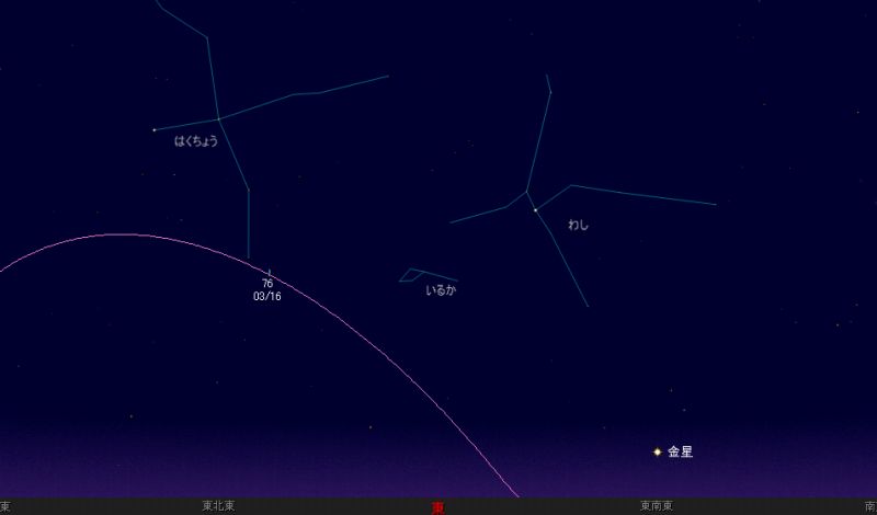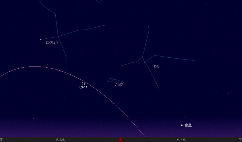 ![]() 2006年3月14日朝4時ごろの東の空。 (以降2日おきの様子を載せています。) ピンク色の線がポイマンスキー彗星の軌道です。 「74」という数字は等級を示して、 予想等級が7.4等級ということになります。 この予想等級は、あくまでも予想なので、 実際にはこれよりも 明るいかもしれませんし、暗いかもしれません。 ![]() 2006年3月16日朝4時の東の空。 ![]() 2006年3月18日朝4時の東の空。 |