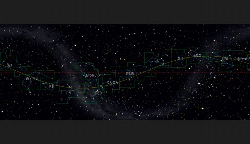 ![]() 真ん中の赤い線が「天の赤道」、 黄色の曲線が「黄道(太陽の通り道)」となります。 緑色の枠は、各星座の領域を示しています。 「前回の全天図」と見比べていただけると、 さそり座の上に へびつかい座が追加されていることが分かります。 |