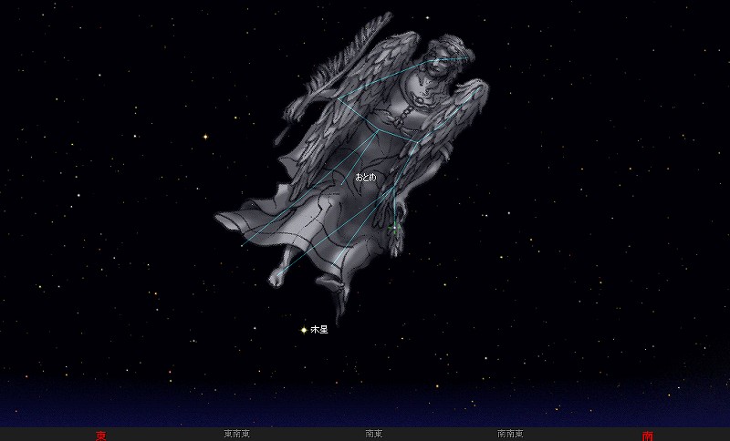 ![]() 2006年4月19日夜21時ごろの南東の空。 いちばん目を引くのは木星でしょうね。 その右上で青白く光っているのがスピカです。 (緑の十字で囲まれている星。) おとめ座は、まだのぼってまもないですね。 これから初夏にかけて見ごろとなります。 ![]() おとめの姿を当てはめてみました。 ご覧いただいているように、 スピカは、おとめが左手に持つ麦の穂先に位置しています。 |