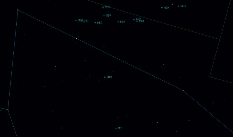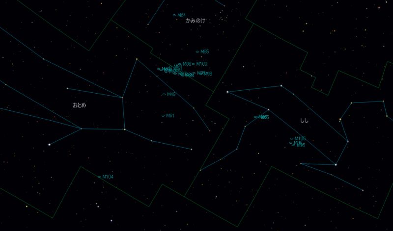 ![]() おとめ座、かみのけ座、しし座付近にある、 メシエカタログに登録された銀河を示してみました。 (緑の囲み線は、各星座の領域です。) ![]() おとめ座とかみのけ座の境界付近をアップにしてみました。 おとめ座銀河団の中心付近にM87が存在すると考えられています。 |