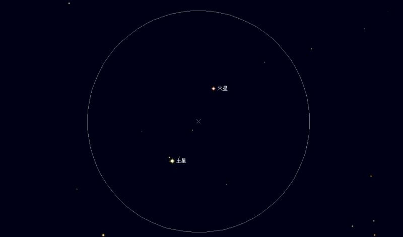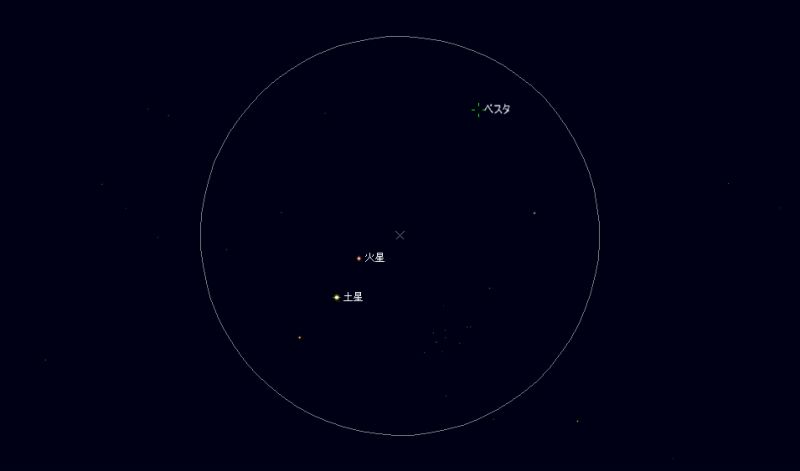 ![]() 2006年6月18日夜20時30分ごろの西の空。 ご覧のように、 土星と火星が、手を繋いでいるくらい近づいています。 ![]() 土星と火星は約34秒角まで接近しています。 (視野円は1.5度に設定。) ![]() 双眼鏡や望遠鏡を使わないと分かりませんけど、 近くには、小惑星ベスタも見ることが出来ます(緑の十字)。 (視野円は5度です。) |