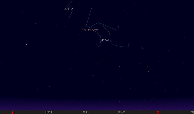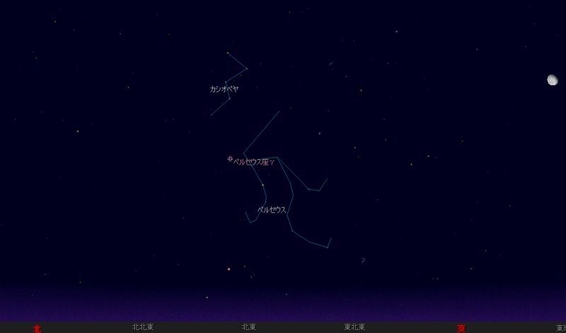 ![]() 2006年8月13日0時(12日24時)ごろの北東の空。 ピンクの十字が輻射点となります。 ペルセウス座流星群の流れ星はこの輻射点を中心に飛びます。 とはいっても、「輻射点はカシオペヤの左下あたり」 くらいの意識があれば充分です。 ![]() 13日2時(12日26時)ごろ。 流れ星は輻射点から離れたところにも当然流れますので、 広範囲に見張る必要があります。 |