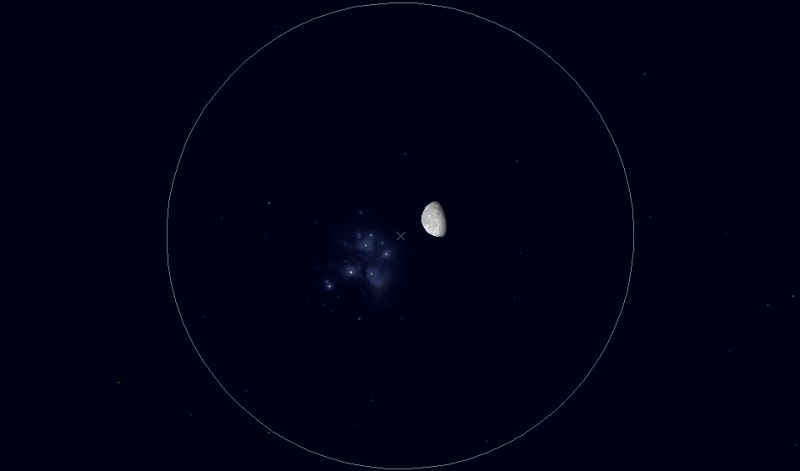 ![]() 2006年9月13日3時30分ごろの南の空。 月齢は20です。 ![]() 視野円は7度。 明け方に向けて 月とすばるが近づいていきます。 |