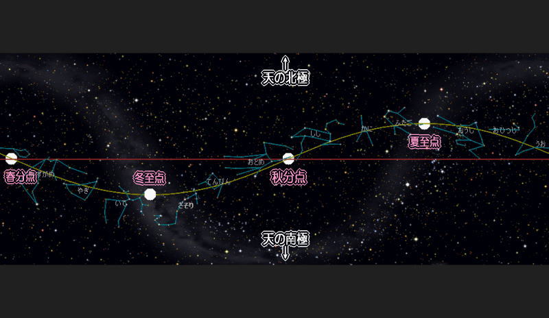 ![]() 赤い線は天の赤道、 黄色い線は黄道(太陽の通り道)です。 丸は太陽を表していて、 その時の太陽の位置を示しています。 秋分:太陽が、天の赤道を北から南に通過する時 ↓ 冬至:太陽が、天の赤道からいちばん南寄りに離れた時 ↓ 春分:太陽が、天の赤道を南から北に通過する時 ↓ 夏至:太陽が、天の赤道からいちばん北寄りに離れた時 |