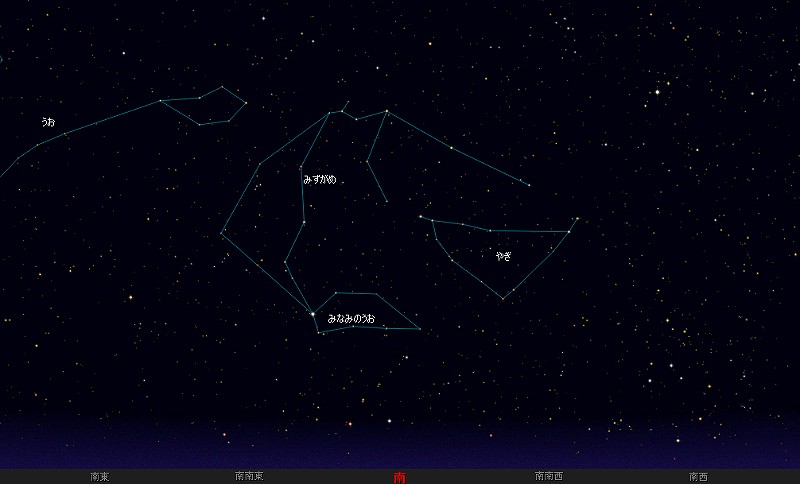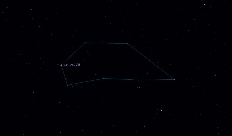 ![]() 10月1日21時ごろの南の空。 緑の十字で囲んである星が フォーマルハウトです。 ![]() 星座絵をはめてみました。 みなみのうお座は、 みずがめ座の甕から流れる神酒を飲んで、 酔っ払っている姿とも言われています。 ![]() フォーマルハウトが分かれば、 他の星は比較的たどりやすい星座です。 |