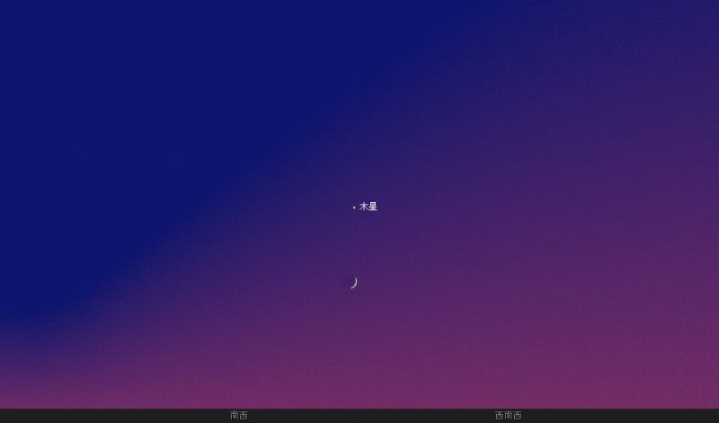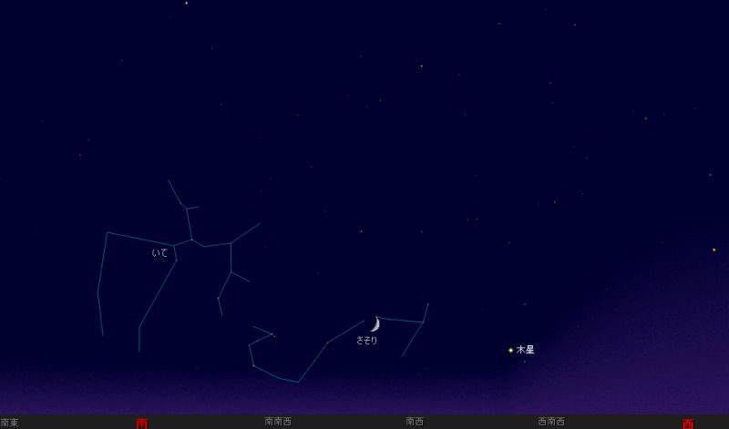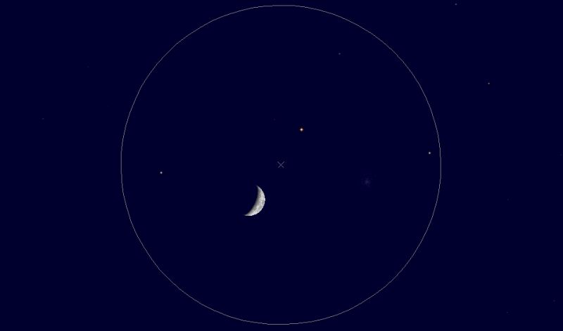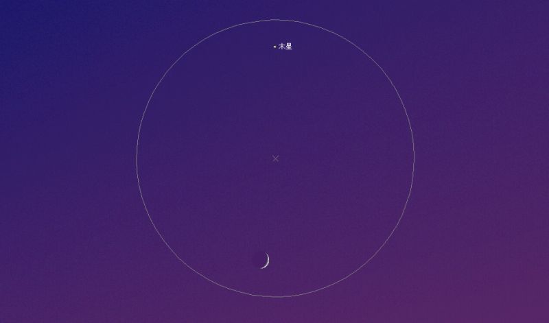 ![]() 2006年9月26日夕方18時ごろ南西の空。 月は三日月すぎの月齢3.9です。 ![]() 視野円は8度。 7倍程度の双眼鏡でも、 月と木星を同じ視野に入れるのはちょっと難しいかも。 |