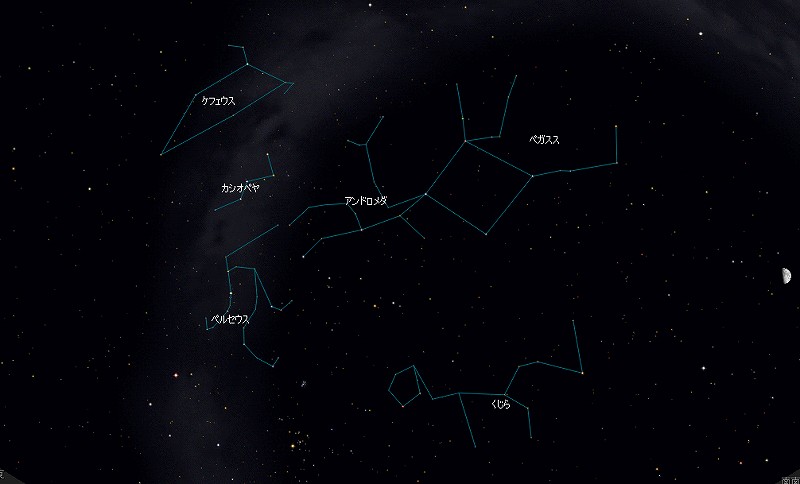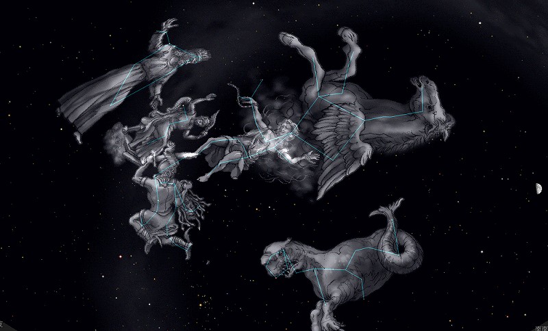 ![]() 2006年10月30日夜21時ごろの南東の空。 ちょうど、くじら座がその巨体を横たえています。 ![]() せっかくなので、 一大神話に登場する秋の星座に登場してもらいました。 ![]() 鎖に繋がれたアンドロメダ、 アンドロメダを襲う化けくじら、 アンドロメダを助けるペルセウス、 ペルセウスを乗せたペガスス、 そして、アンドロメダの両親ケフェウスとカシオペヤです。 |