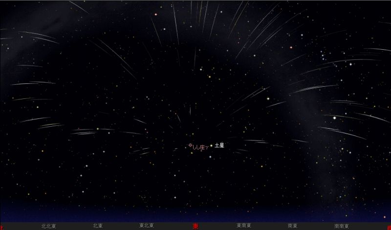 ![]() 2006年11月18日2時(17日26時)ごろの北〜東〜南の空。 しし座がその姿を現し始めました。 土星の左側に輻射点(流星が飛ぶ中心点)があります。 ![]() 今年は日本での大出現は予想されていません。 なので、こんな風に流星雨になるかは分かりません。。。 (この図はあくまでもイメージです。) |