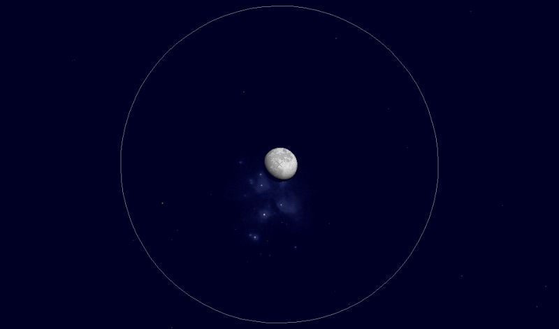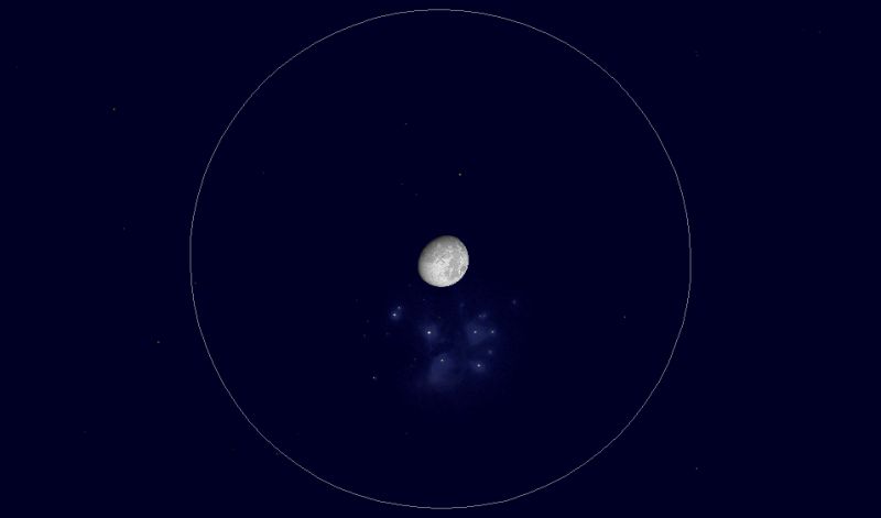![]() 2006年12月31日夕方18時30分ごろの東の空。 月齢は10.8です。 ![]() 既に、月がすばるを隠し始めています。 (視野円は5度。) ![]() 20時ごろの様子。 ![]() 21時30分ごろの様子。 |
