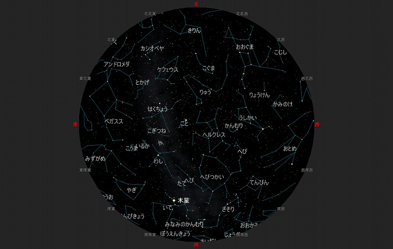 ![]() 2008年8月の星空の様子 南の空 上旬21時ごろ 中旬20時ごろ 下旬19時ごろ (以下、同様) ![]() 南〜天頂 ![]() 東の空 ![]() 北の空 ![]() 西の空 ![]() 星座早見 (南が下) ![]() 8月上旬の木星の位置 (21時ごろ) ![]() 8月中旬の木星の位置 (21時ごろ) ![]() 8月下旬の木星の位置 (21時ごろ) |