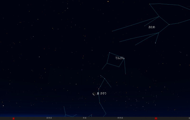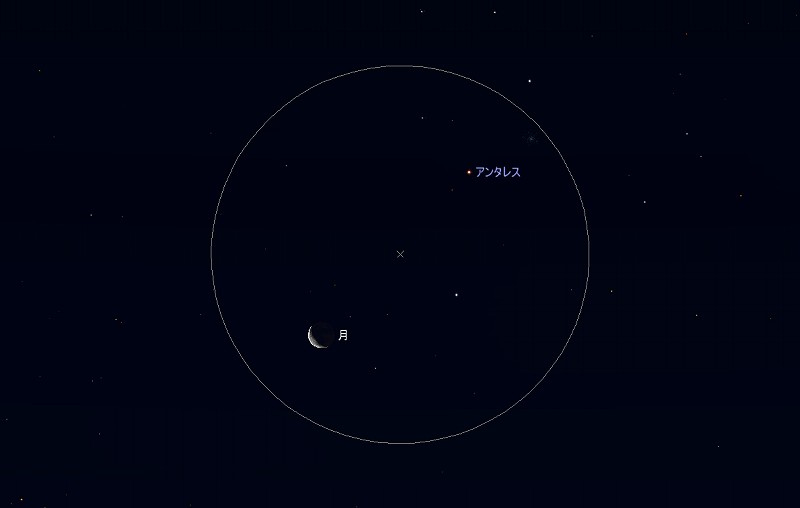 ![]() 2009年1月22日、日の出前の南東の空。 (月齢25.3) ![]() 逆三日月とアンタレス (視野円7度) |