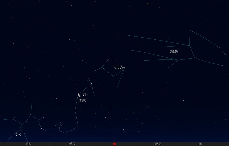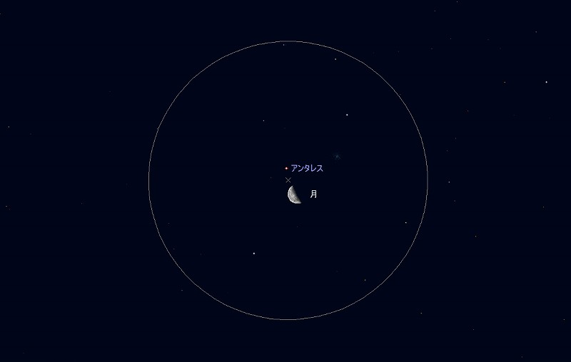 ![]() 2009年2月18日早朝5時ごろの南の空。 ![]() 下弦の月とアンタレスのランデブー。 (視野円7度) |