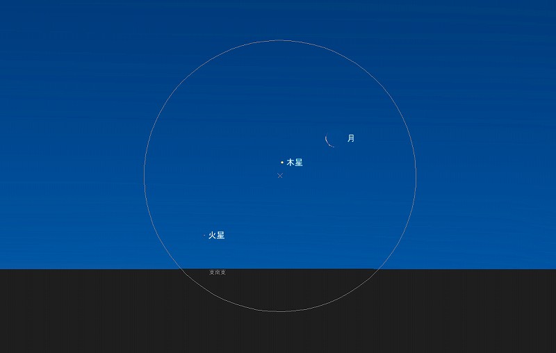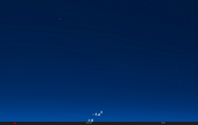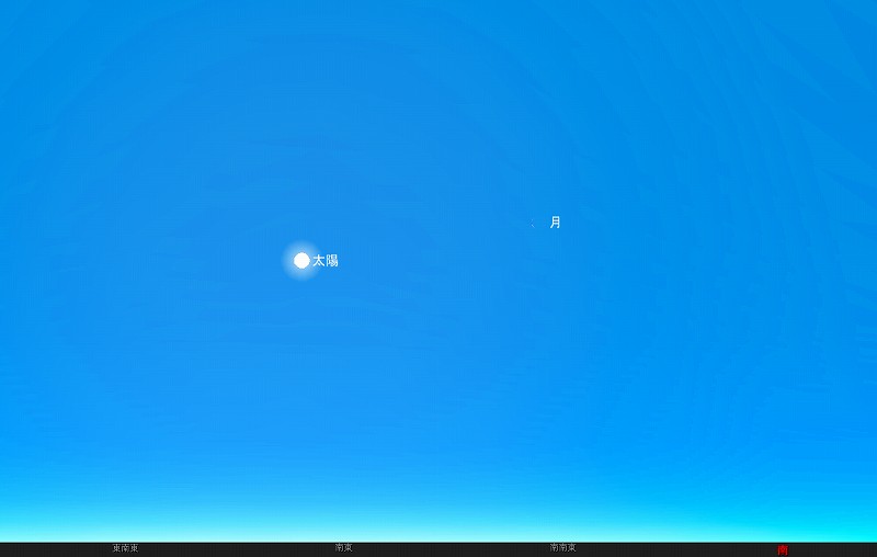 ![]() 2009年2月23日、日の出直前の東南東の空。 ![]() 月、木星、火星、水星の4天体会合。 (水星は月に隠れてます。) ![]() 東京付近での水星の出現 (5時45分ごろ) ![]() 9時ごろの月と太陽の位置関係。 ![]() 東京付近での木星の潜入 (9時3分ごろ) ![]() 東京付近での木星の出現 (10時34分ごろ) |