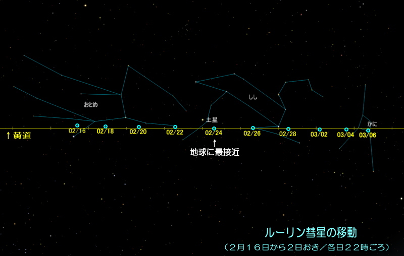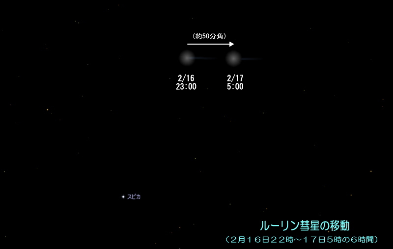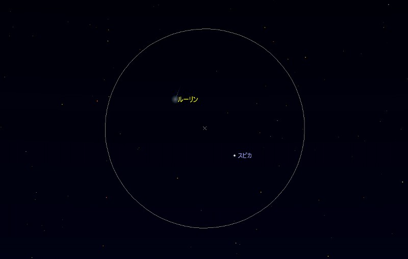 ![]() 2009年2月16日23時ごろの東の空。 ルーリン彗星は、 おとめ座1等星スピカ付近を通過中。 ![]() 視野円7度 ![]() 月の視直径が約30分角なので、 6時間で月の1.5倍ほども移動します。 ![]() |