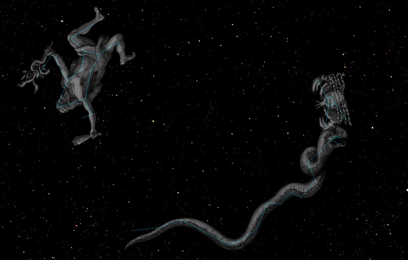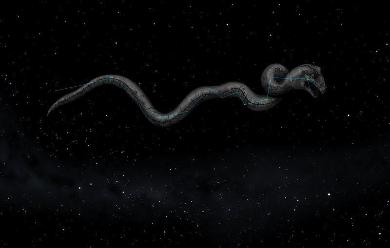 ![]() 2009年4月上旬20時ごろのうみへび座。 うみへびの頭と2等星アルファルド(緑十字)が南中するころです。 ![]() 2009年4月中旬20時ごろのうみへび座。 ![]() 2009年4月下旬20時ごろのうみへび座。 南西から南東まで実に100度もある大星座。 ![]() 天の川を海に見立てれば、その姿はまさにウミヘビ。 ![]() ヘラクレス(ヘルクレス座)によってやっつけられた、 ヒュドラ(うみへび座)と化け蟹(かに座)。 |