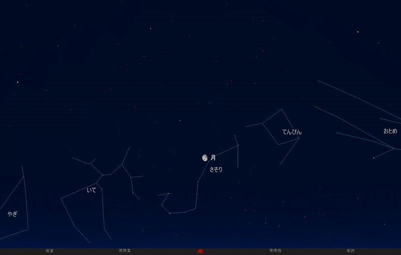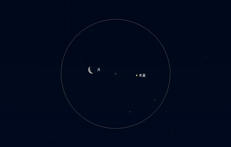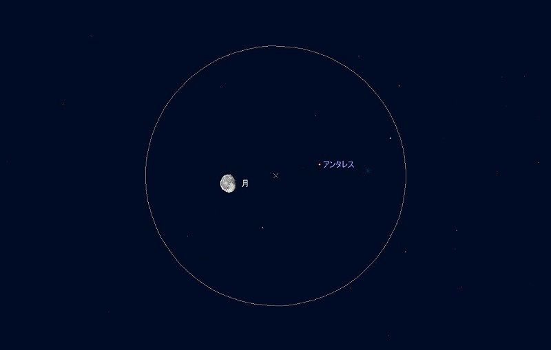 ![]() 2009年4月14日未明3時ごろの南の空。 (月齢18.1) ![]() 視野円7度 |
