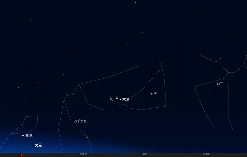 ![]() 2009年4月20日早朝4時ごろの南東の空。 東の低空には金星と火星も顔を出します。 (月齢24.1) ![]() 視野円7度 |