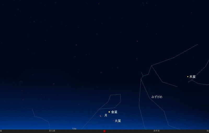 ![]() 2009年4月23日早朝4時ごろの東の空。 (月齢27.1) ![]() 視野円7度 |