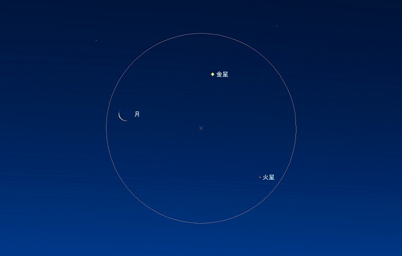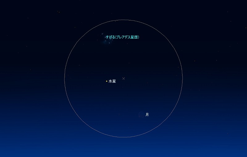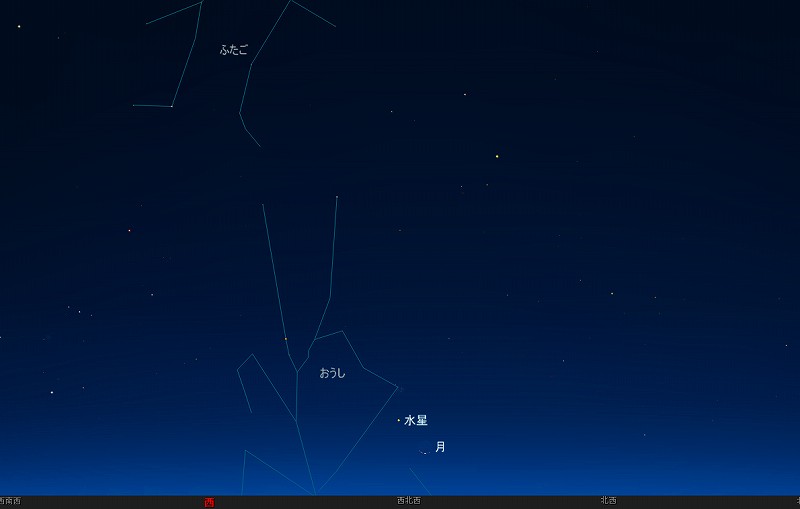![]() 2009年4月26日19時すぎごろの西の空。 水星が東方最大離角。 (月齢1.3) ![]() 視野円10度 |