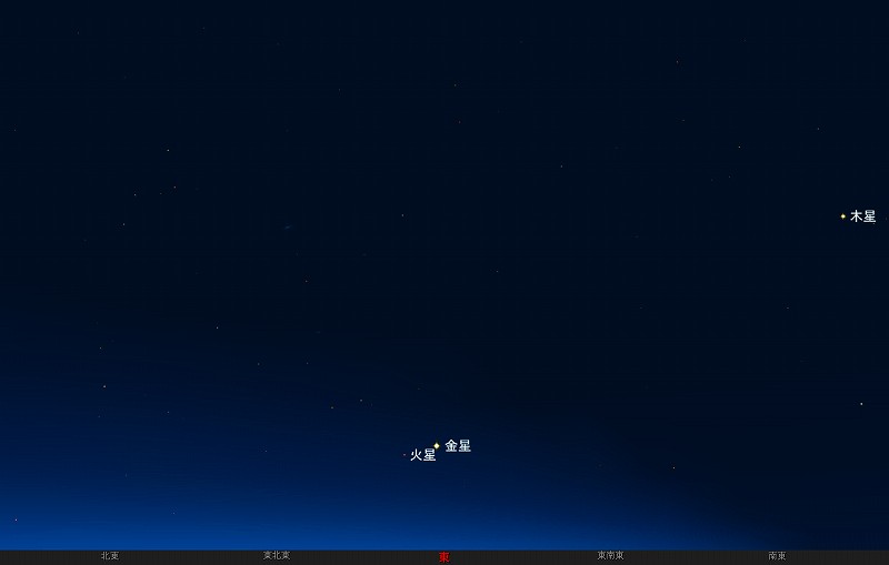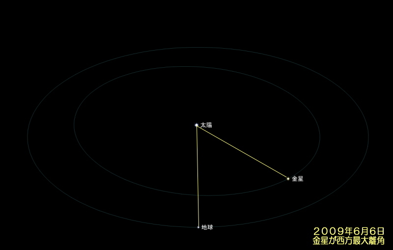 ![]() 2009年6月3日20時ごろの南の空。 (月齢9.9) ![]() 視野円7度 ![]() 2009年6月6日未明3時30分ごろの東の空。 金星が西方最大離角。 ![]() |
