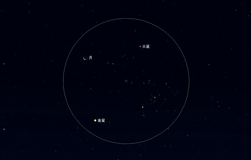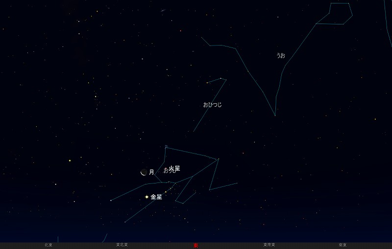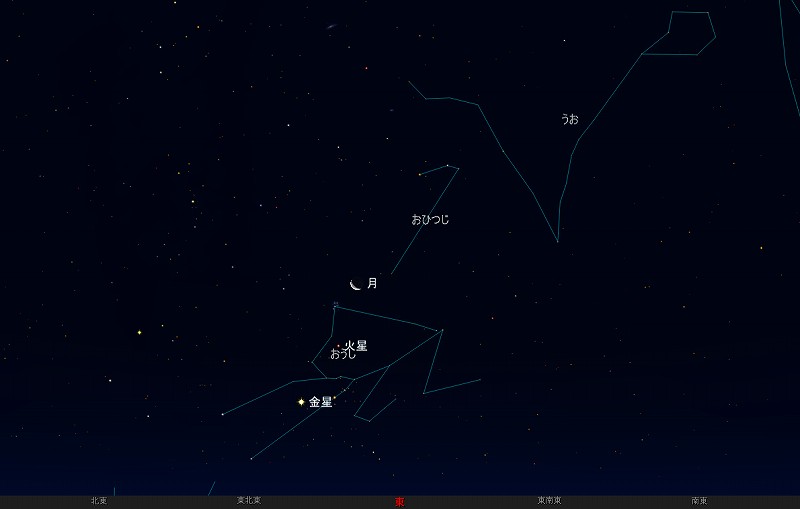 ![]() 2009年7月18日未明3時ごろの東の空。 (月齢24.9) ![]() 逆三日月とすばる (視野円7度) ![]() 2009年7月19日未明3時ごろの東の空。 (月齢25.9) ![]() 月、金星、火星、ヒヤデス星団が集合。 (視野円15度) |